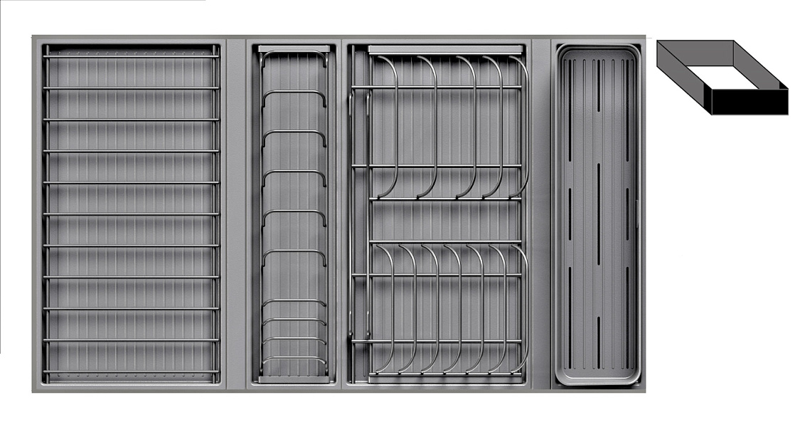 Модель — 1 большой модуль для посуды + 1 большой модуль с решеткой + 1 малый модуль для посуды + модуль для столовых приборов